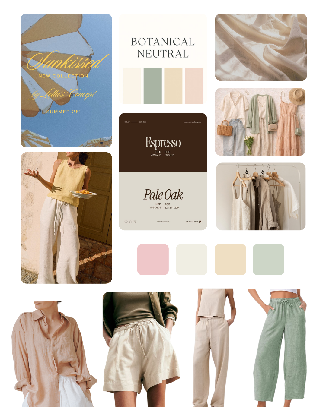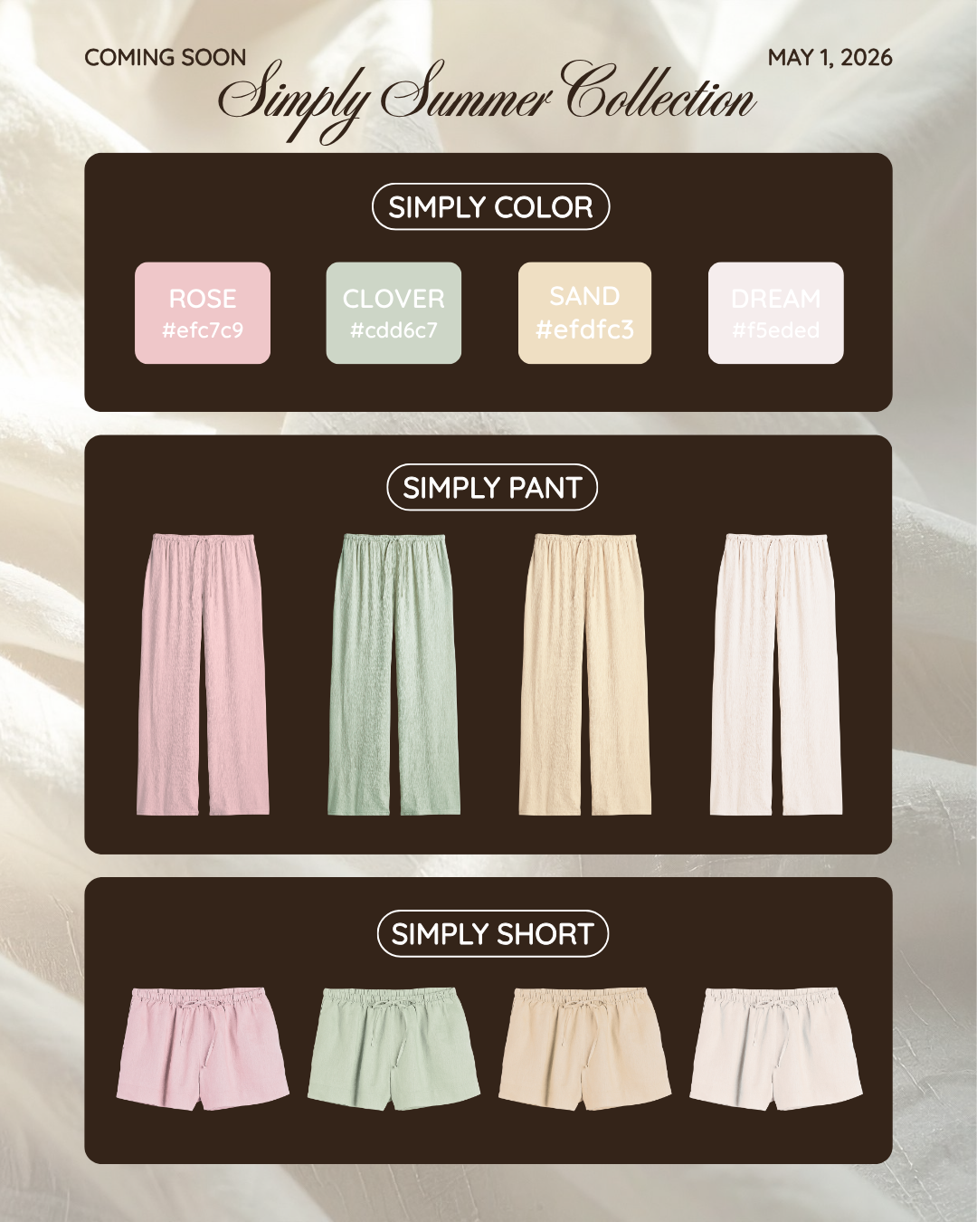 A soft, neutral palette was curated to evoke warmth and ease, using beige as the foundation and rich brown as an anchoring accent. Subtle pastel fabrics complement the collection, allowing the clothing to feel light and pair well across the palette.