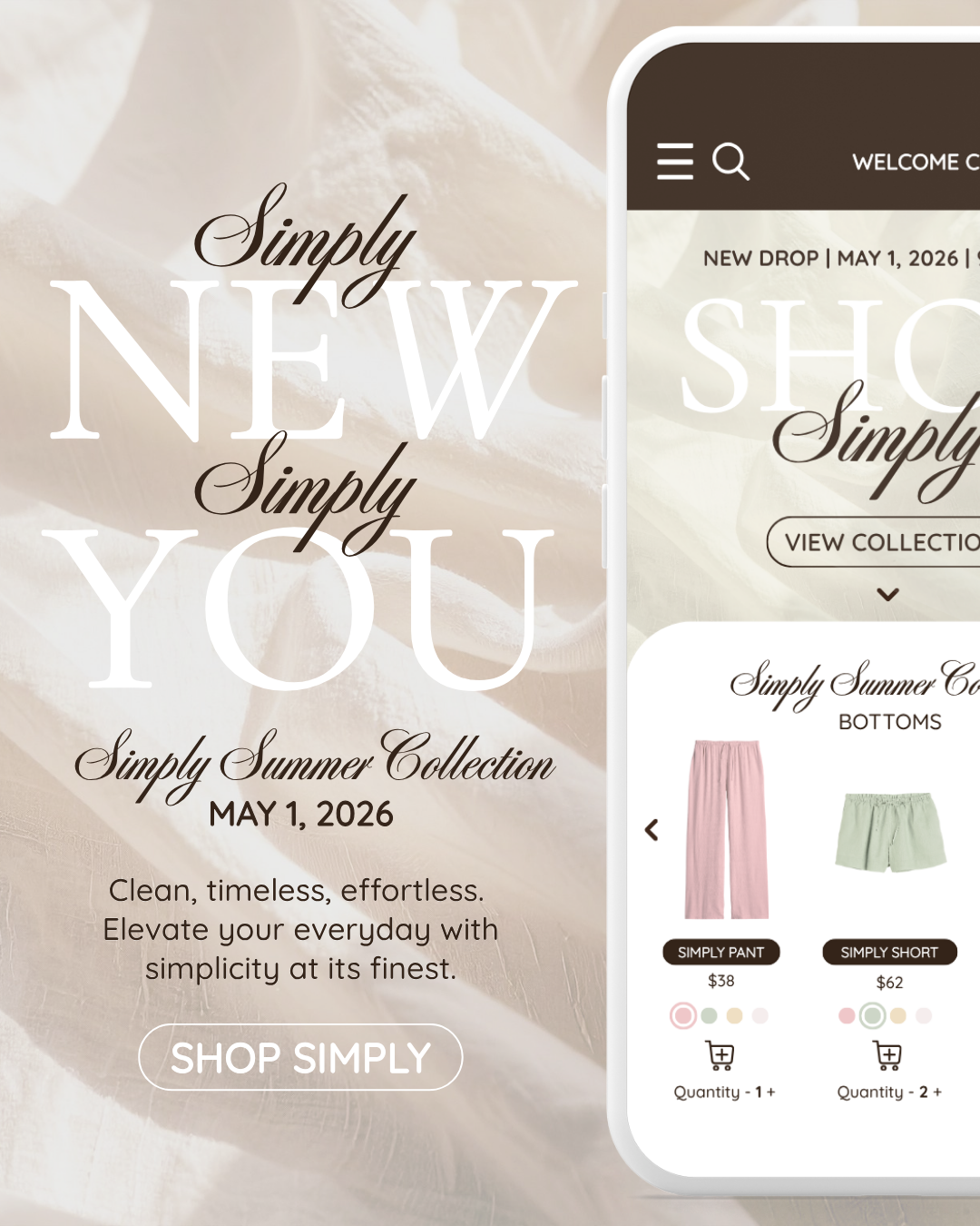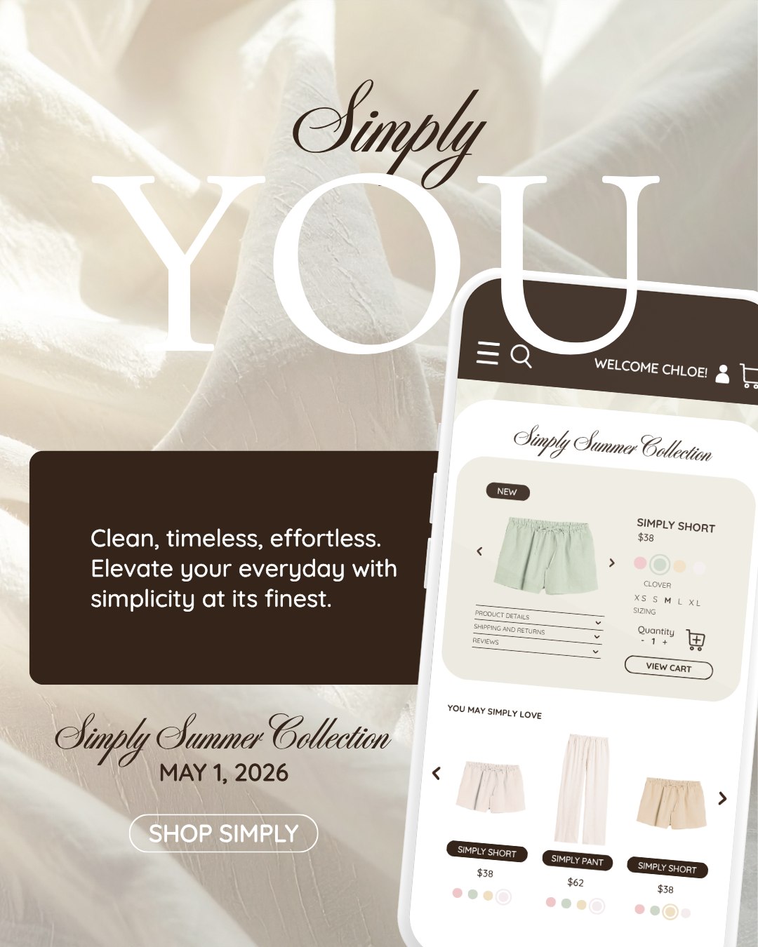 The messaging centers around the phrase “Simply New, Simply You" reinforcing an invitation of personal style through minimal, refined design. This narrative guided both the UI experience and the social campaign visuals.