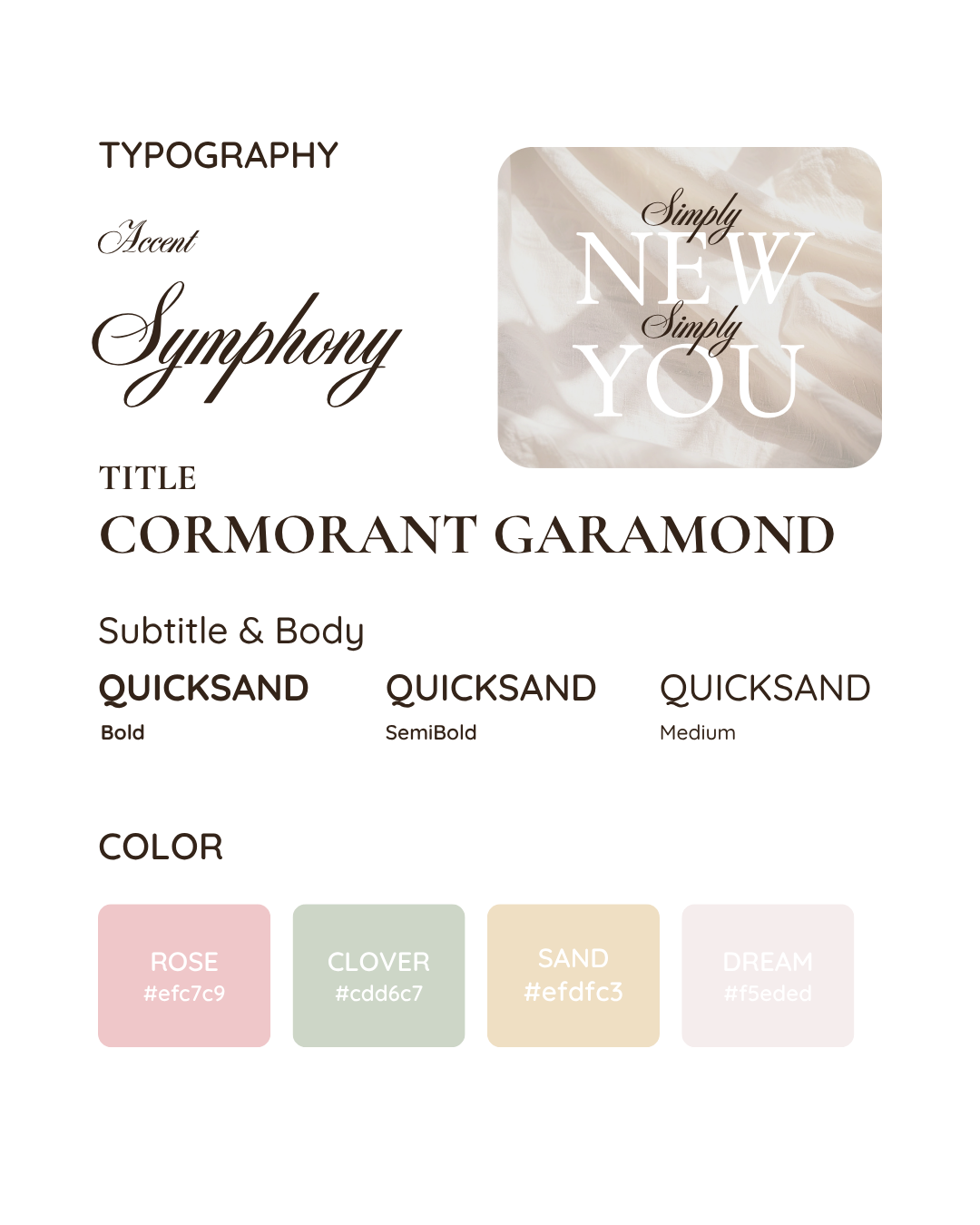 A high-contrast serif script introduces femininity and movement with an elegant touch while a rounded, modern sans-serif provides clarity and speaks to the theme of simplicity.