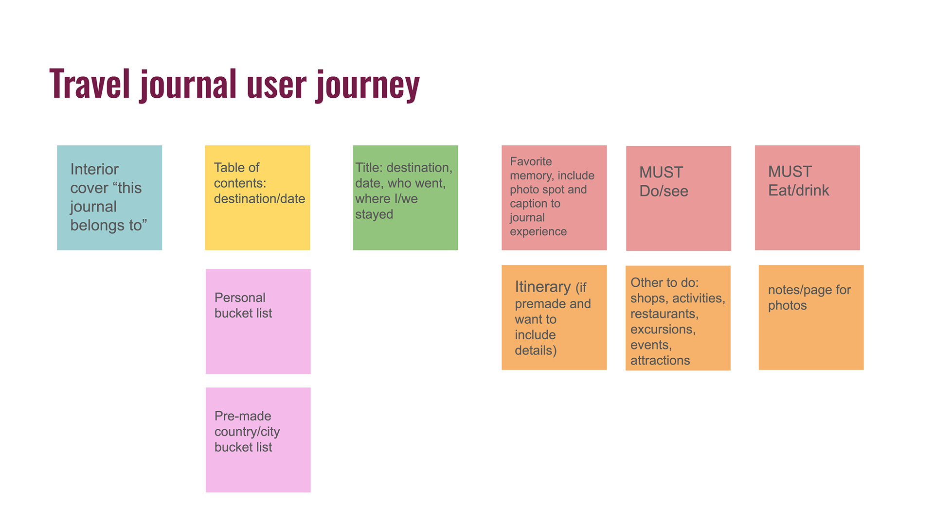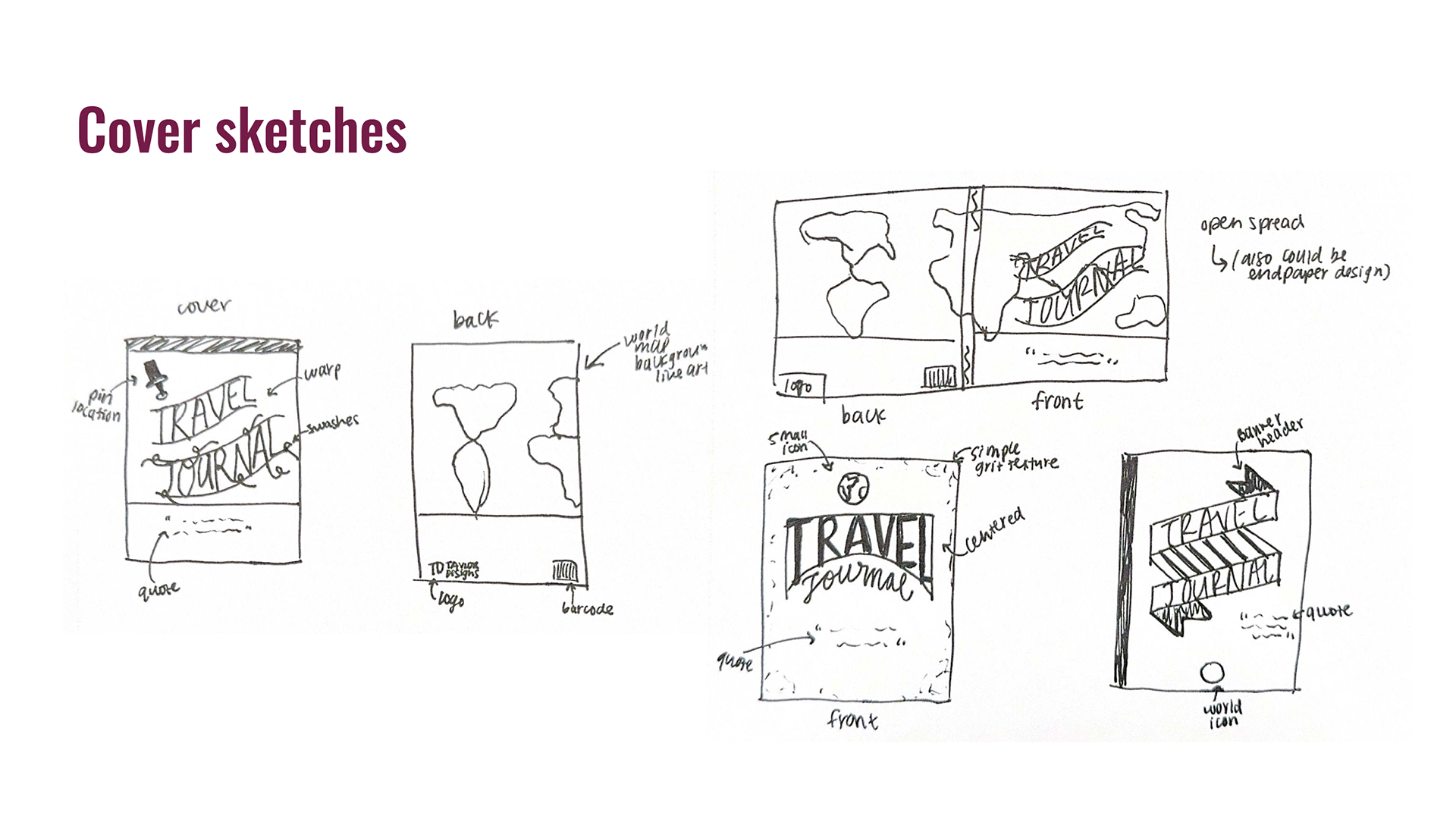 Milestone 2 consisted of creating my brand, Taylor Designs, further research on material selection, as well as creating moodboards for the interior spreads and cover illustrations of the travel journal itself. Establishing my brand and the focus of material research was the biggest priority in this milestone to propel the project forward to the final design. This week I presented all my progress so far including my finalized brand identity, further material research, beginning paper outline and annotated bibliography, journal user journey and cover design sketches. After feedback from my milestone presentation, this week my focus was to organize my user journey to draft interior spreads of the journal layout.