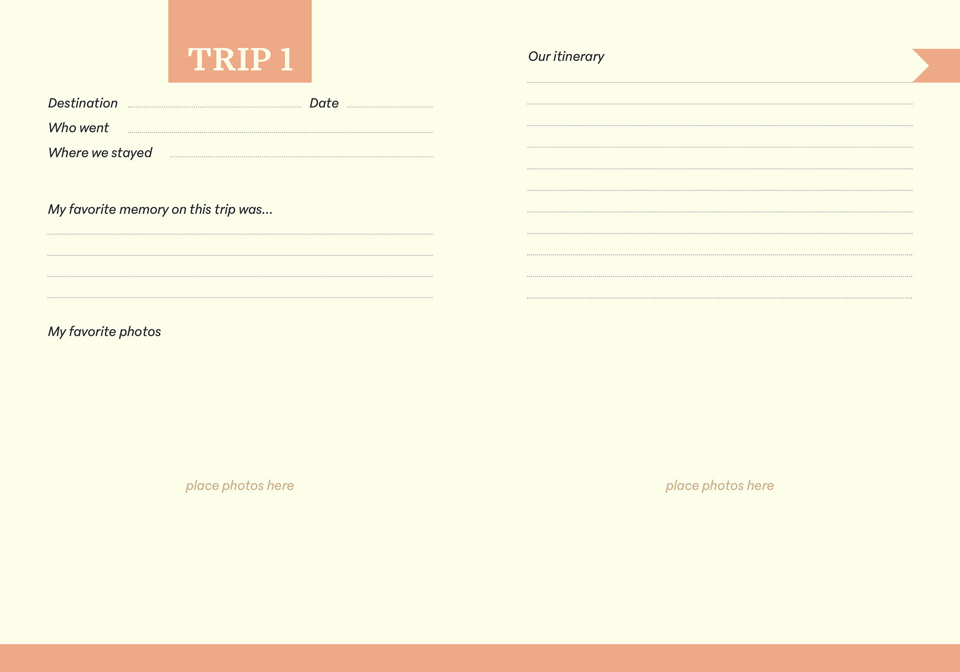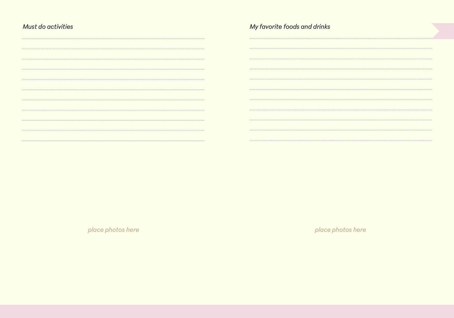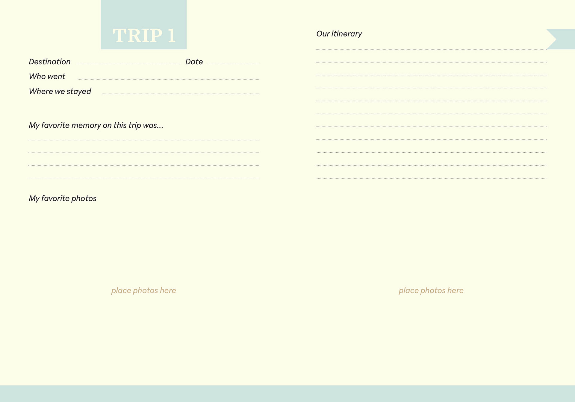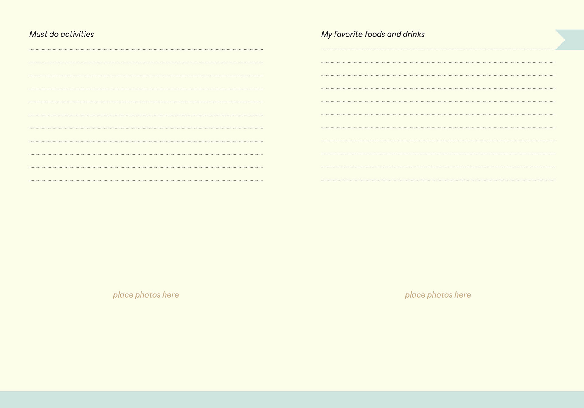 I tested my first version of the journal layout with one color palette including teal, orange, brown and cream. I created the Table of Contents and Bucket List pages first, followed by the first section for documenting a trip. The Trip One layout is laid out to show the first spread you would buy in the journal, this includes the general information with the destination, date, who you went with, and where you stayed. This same page has a space to journal about your favorite memory of the trip and include photos. All of the following pages are interchangeable and customizable for the users choice. These pages include an itinerary, must do activities, favorite food and drinks, other activities, and notes. Simple elements like the color bookmark tag, color bar at the bottom, and subtle dotted lines for writing add detail to the design to create a soft, delicate connection to the user. I met with my mentor Sarah about this initial design, she overall thought the layout worked really well. She just had small suggestions for spacing and lengthening the lines as well as testing a cream or off-white color in the background to test what paper may look best with the colors. I made these updates for version 2 and implemented my other color palette options.