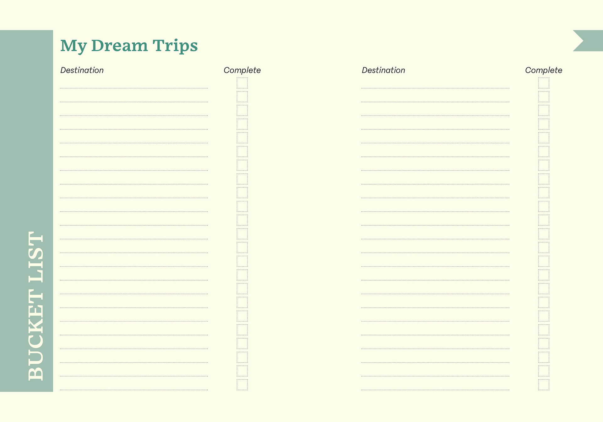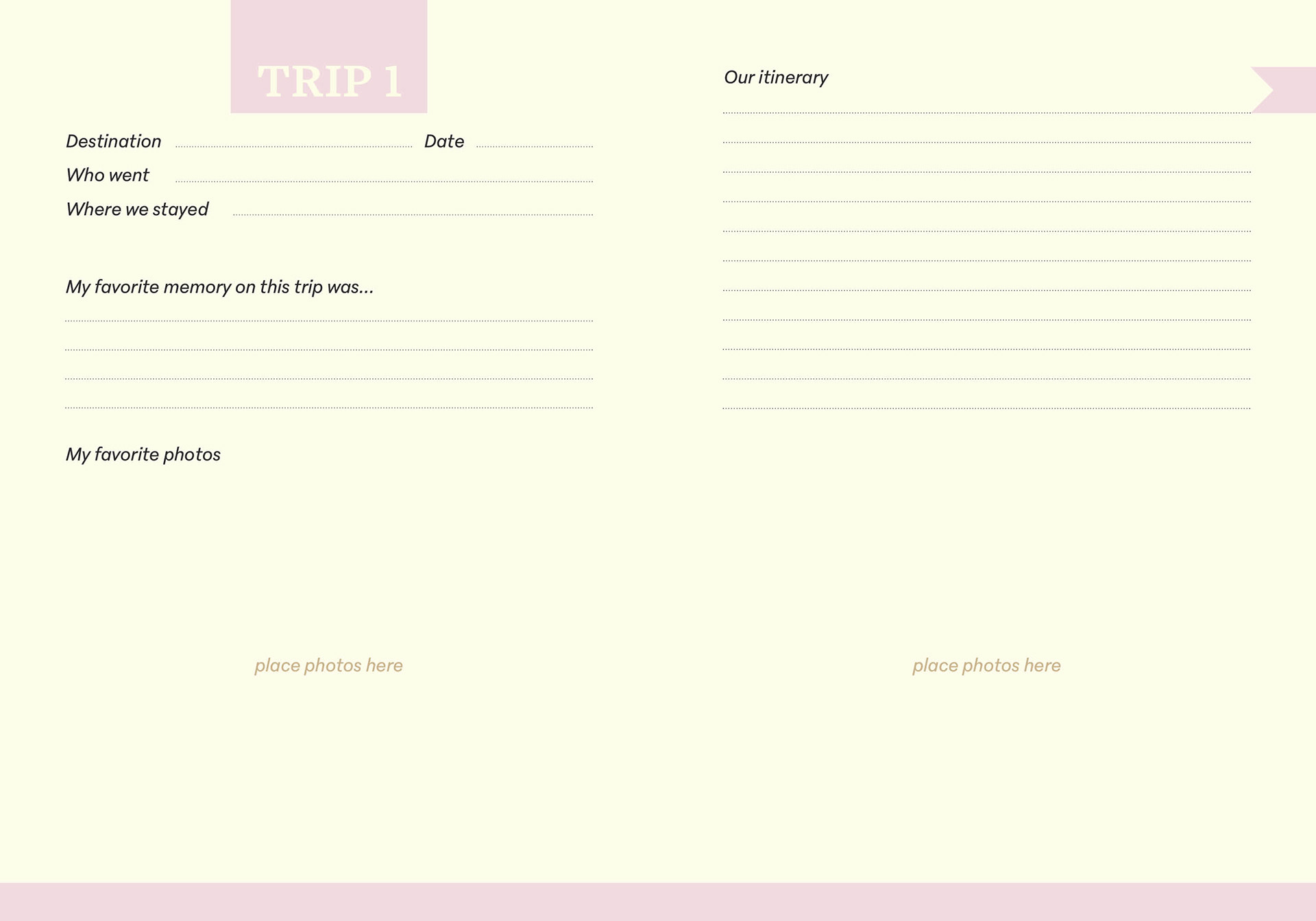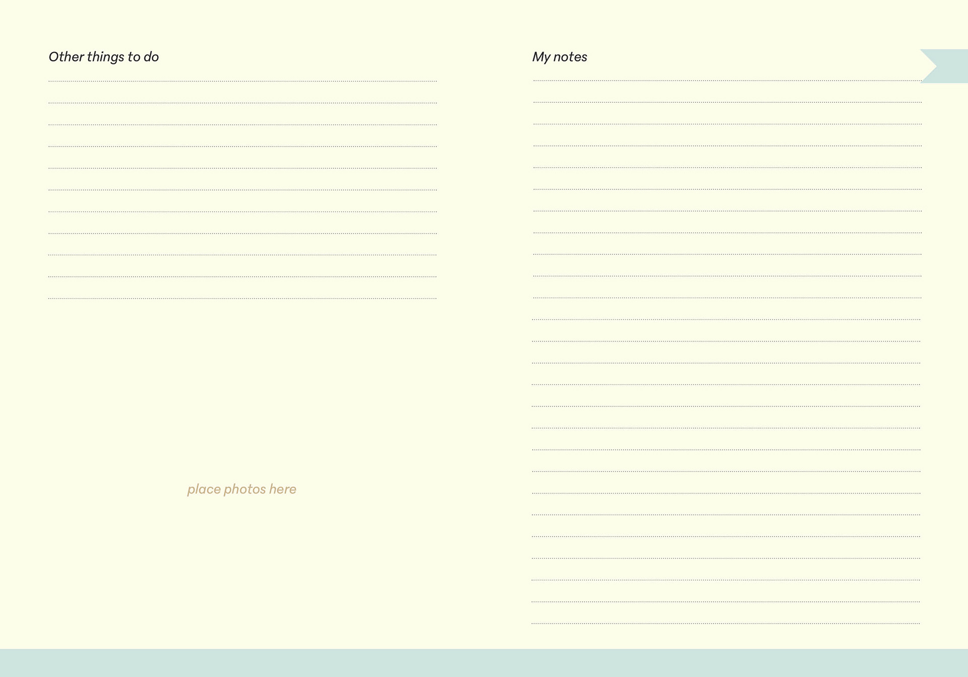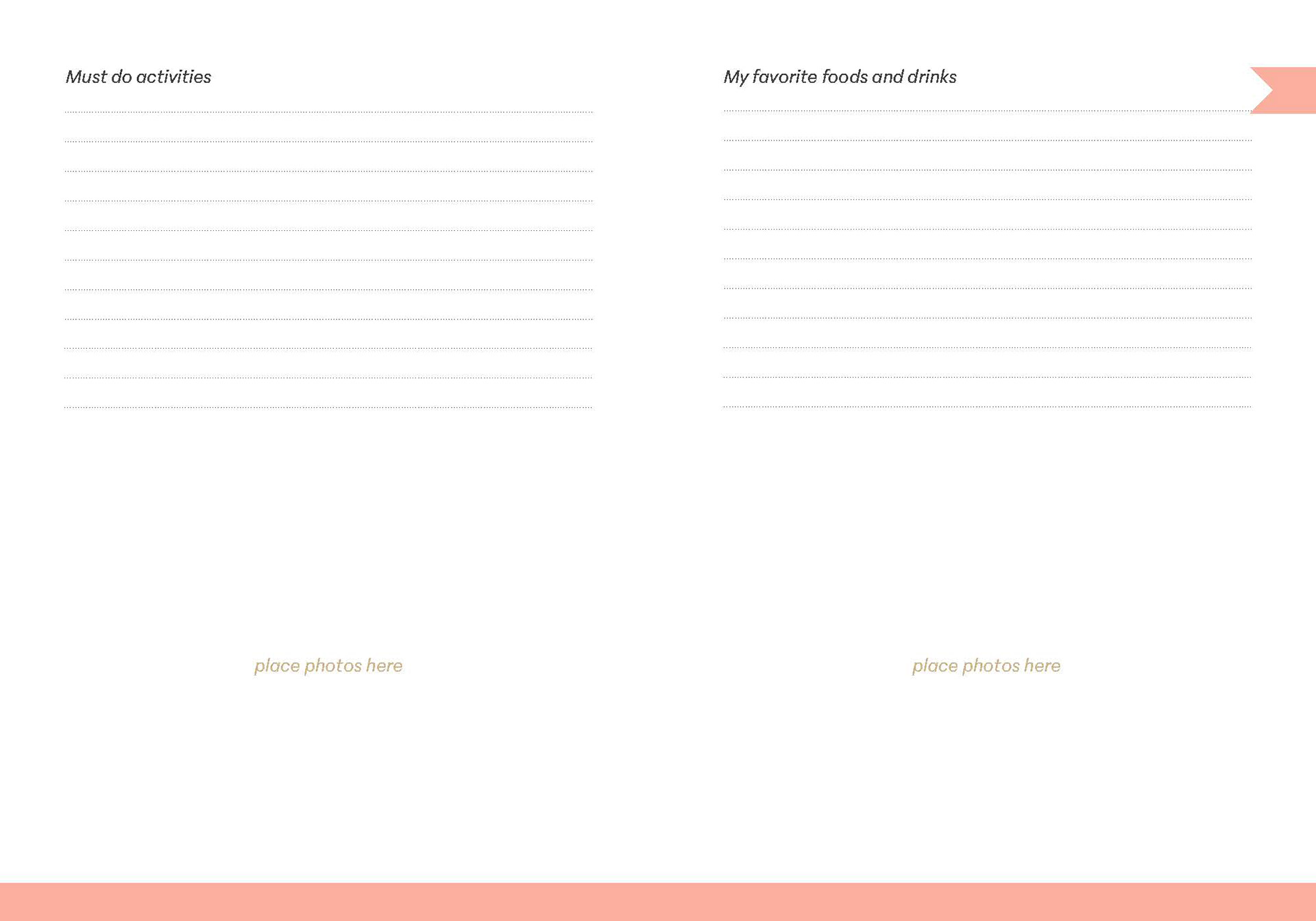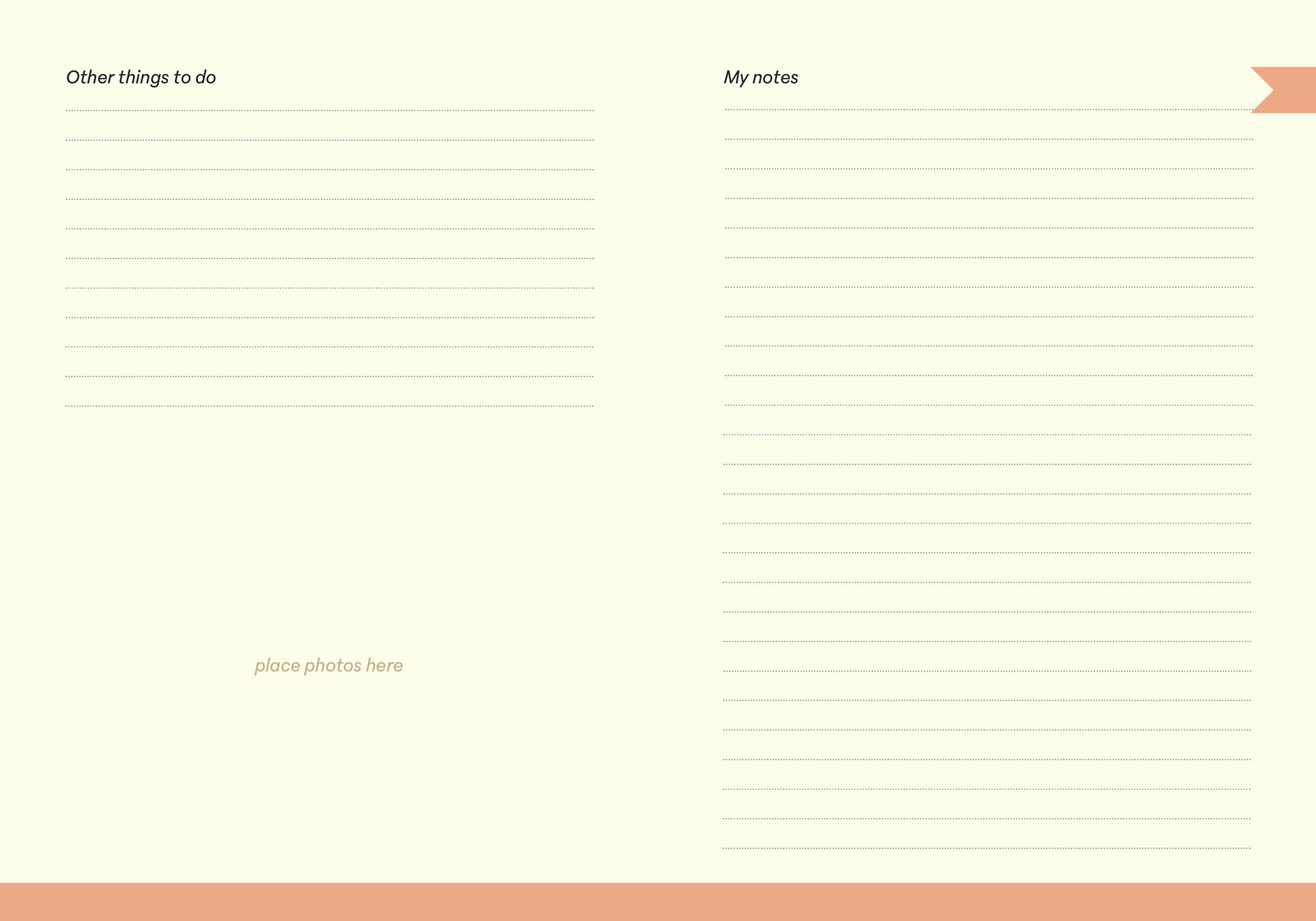 I tested my first version of the journal layout with one color palette including teal, orange, brown and cream. I created the Table of Contents and Bucket List pages first, followed by the first section for documenting a trip. The Trip One layout is laid out to show the first spread you would buy in the journal, this includes the general information with the destination, date, who you went with, and where you stayed. This same page has a space to journal about your favorite memory of the trip and include photos. All of the following pages are interchangeable and customizable for the users choice. These pages include an itinerary, must do activities, favorite food and drinks, other activities, and notes. Simple elements like the color bookmark tag, color bar at the bottom, and subtle dotted lines for writing add detail to the design to create a soft, delicate connection to the user. I met with my mentor Sarah about this initial design, she overall thought the layout worked really well. She just had small suggestions for spacing and lengthening the lines as well as testing a cream or off-white color in the background to test what paper may look best with the colors. I made these updates for version 2 and implemented my other color palette options.
