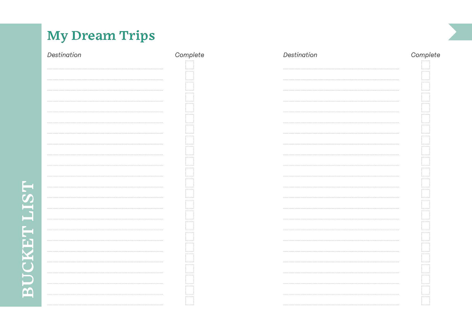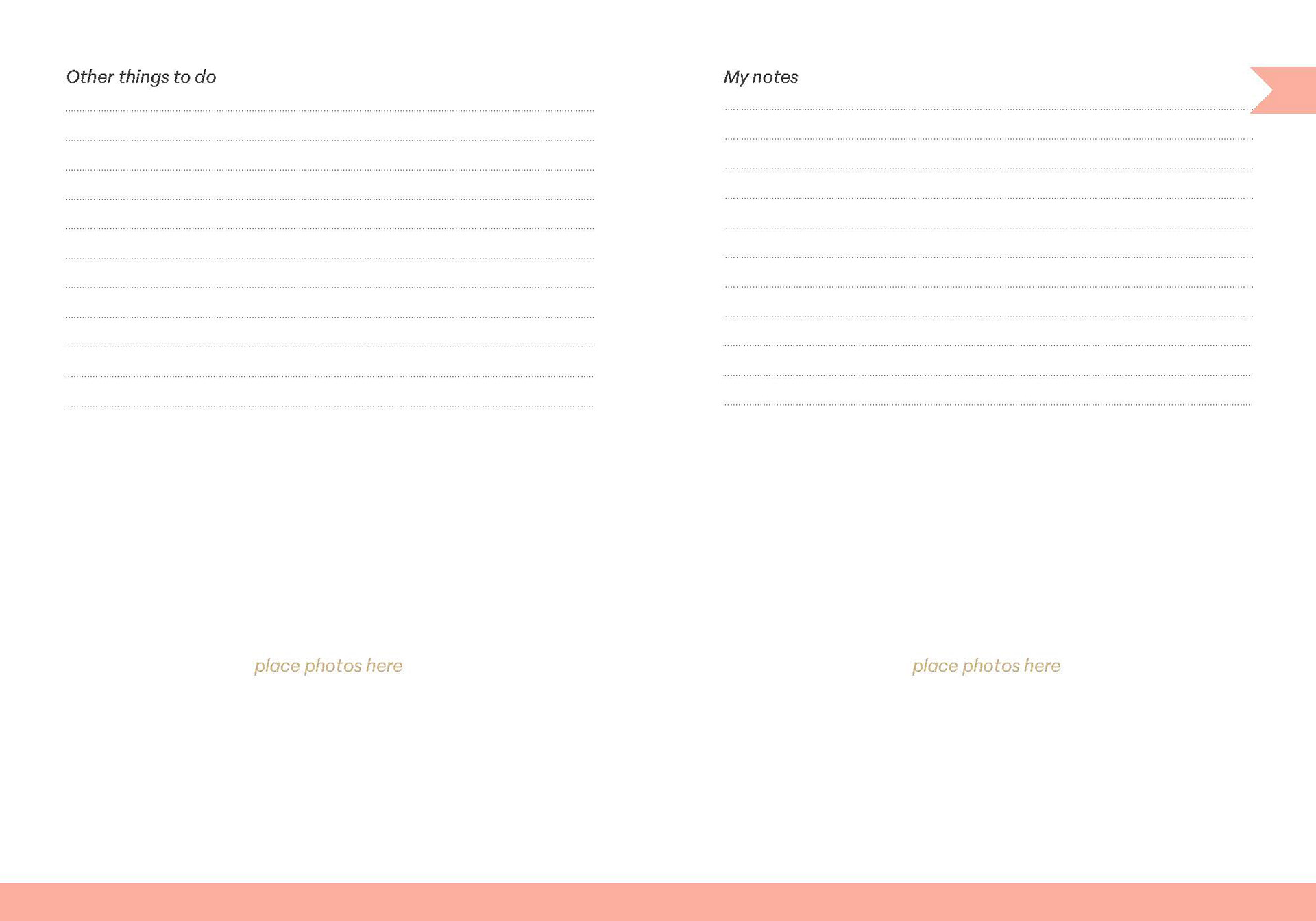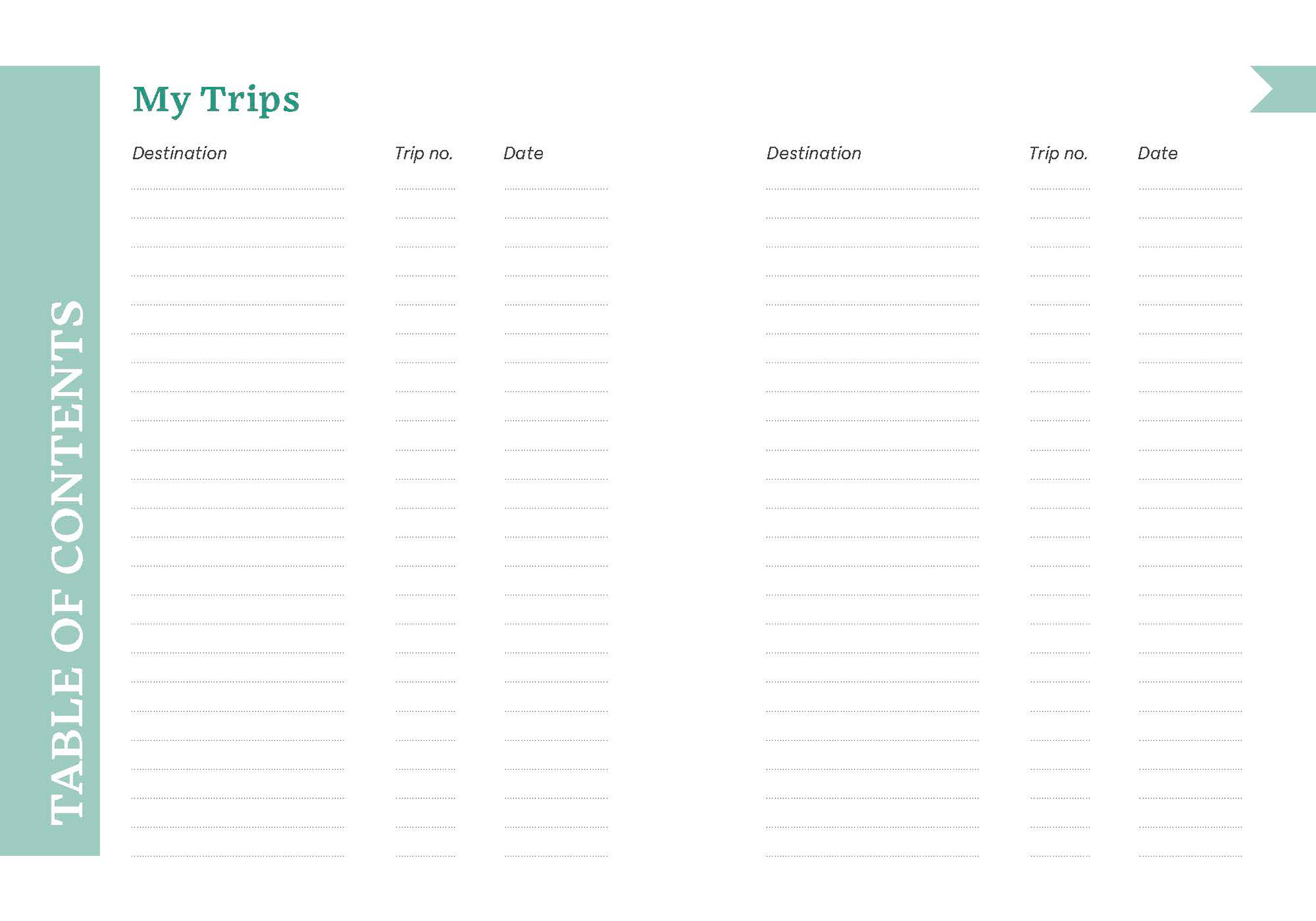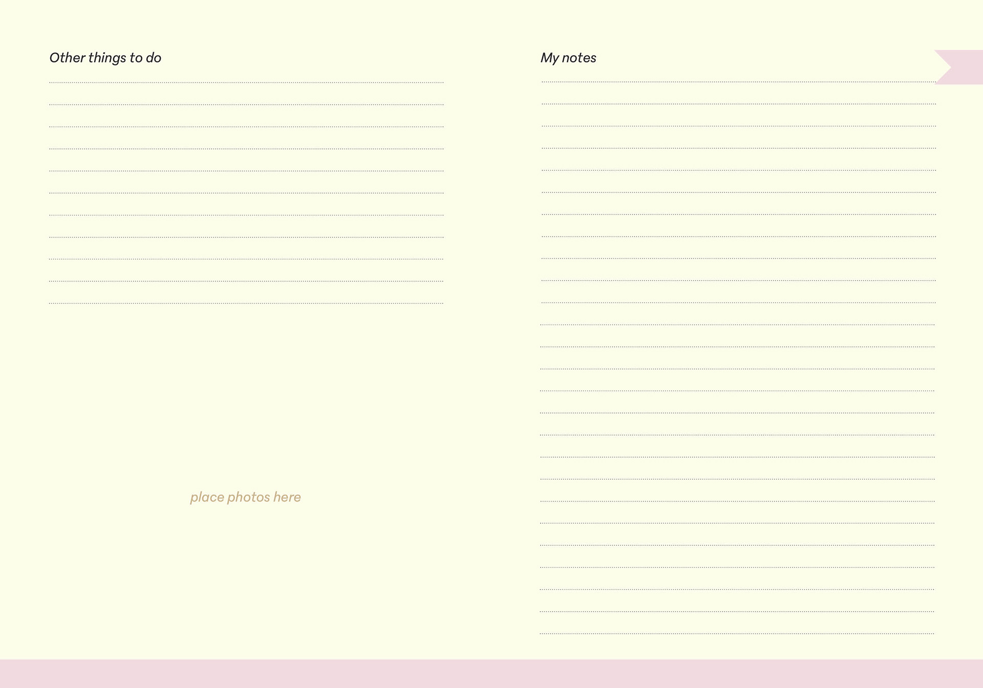 I tested my first version of the journal layout with one color palette including teal, orange, brown and cream. I created the Table of Contents and Bucket List pages first, followed by the first section for documenting a trip. The Trip One layout is laid out to show the first spread you would buy in the journal, this includes the general information with the destination, date, who you went with, and where you stayed. This same page has a space to journal about your favorite memory of the trip and include photos. All of the following pages are interchangeable and customizable for the users choice. These pages include an itinerary, must do activities, favorite food and drinks, other activities, and notes. Simple elements like the color bookmark tag, color bar at the bottom, and subtle dotted lines for writing add detail to the design to create a soft, delicate connection to the user. I met with my mentor Sarah about this initial design, she overall thought the layout worked really well. She just had small suggestions for spacing and lengthening the lines as well as testing a cream or off-white color in the background to test what paper may look best with the colors. I made these updates for version 2 and implemented my other color palette options.