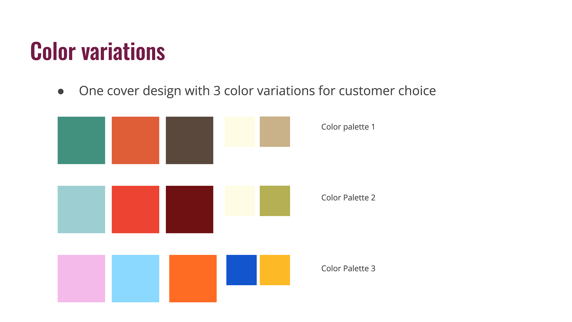 My cover design iterations include the 3 color palette options with 3 design options I am exploring. The first design has a bevel and extrude effect to emphasize the 3-D type, the second design includes the travel pattern in the background at a low opacity to fill the negative space, and the third design is a simplified type header to let the bright colors shine.