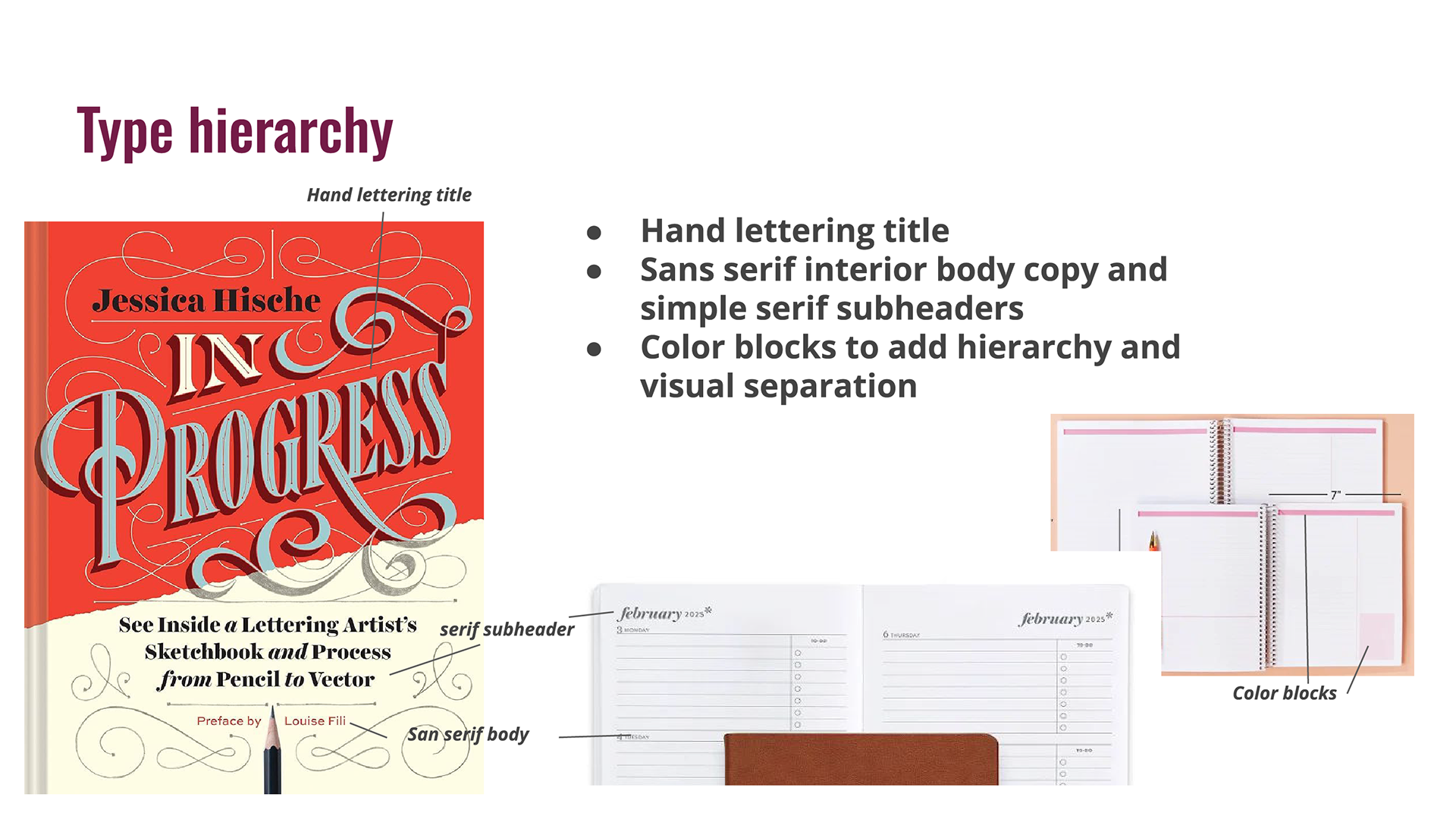 Case study research for material selection in production processes. This elevates the importance of the interactive experience of my project by choosing the right material to connect with my target audience and create a memorable experience. I also made my milestone 2 presentation with updates for my journal mood boards and completed Taylor Design's brand.