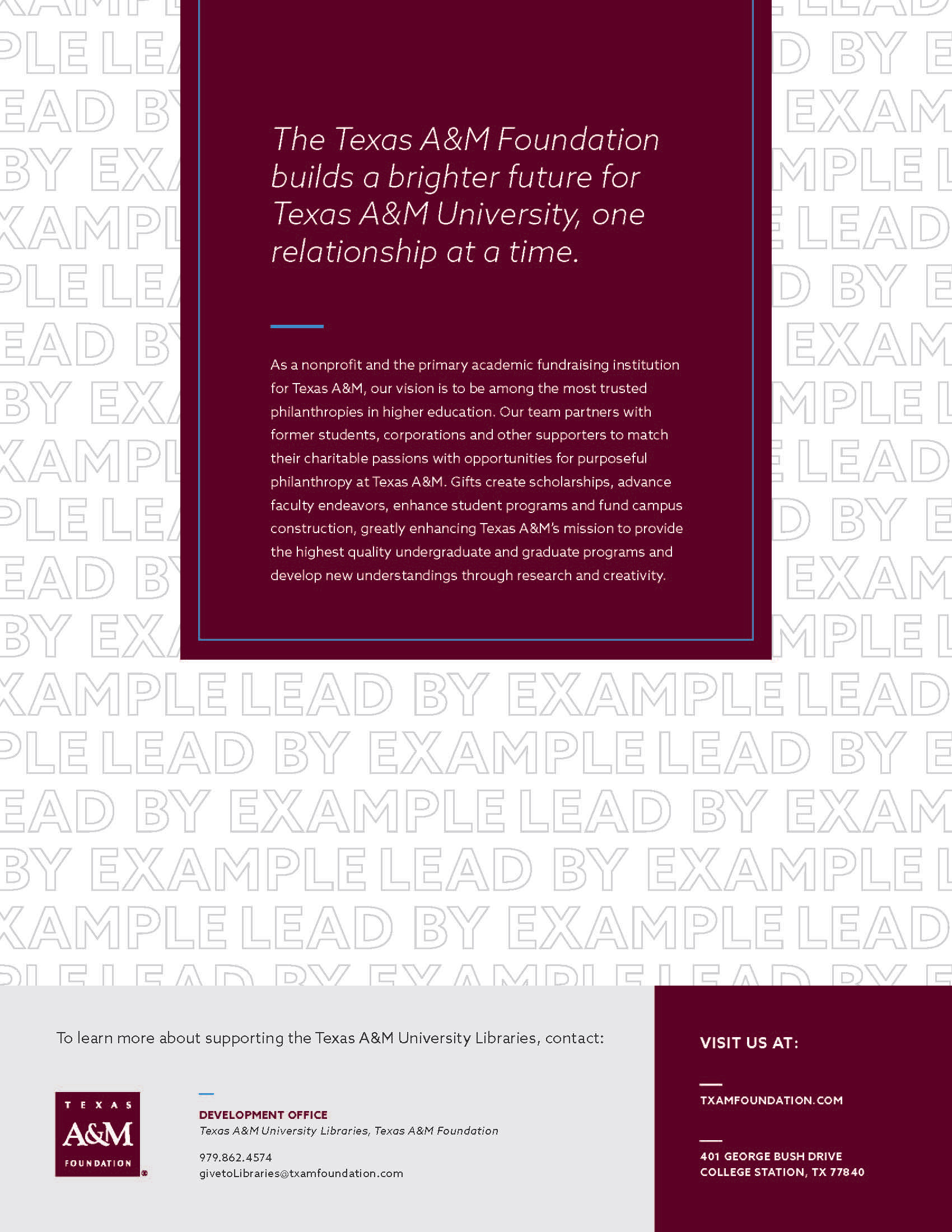As a Graphic Design Student Assistant at the Texas A&M Foundation, I assist in the overall implementation and maintenance of the Texas A&M Foundation brand to further the mission of building a brighter future for Texas A&M University. I design and edit Foundation brochures and one-pagers for colleges and units across Texas A&M University as well as design and edit ads, potential donor proposals, stationery, and modern branded social media graphics. I am also proficient at building marketing emails and HTML code through Salesforce Marketing Cloud.